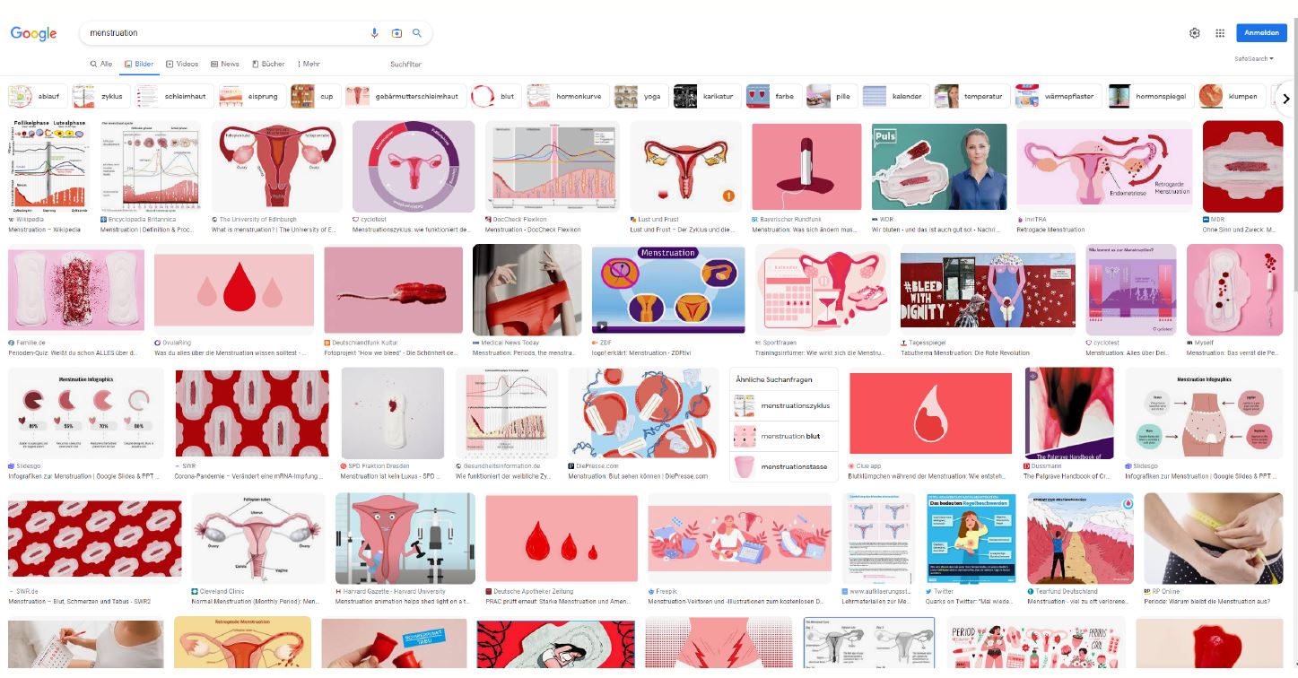 Educational materials, hygiene products, and apps frequently feature designs characterized by pink and floral motifs. In most cases menstruating individuals do not identify with this stereotypical design. The perceived "feminine" aesthetics are criticised for compromising functionality and downplaying the seriousness of the subject. A factual and gender-neutral representation is desired.