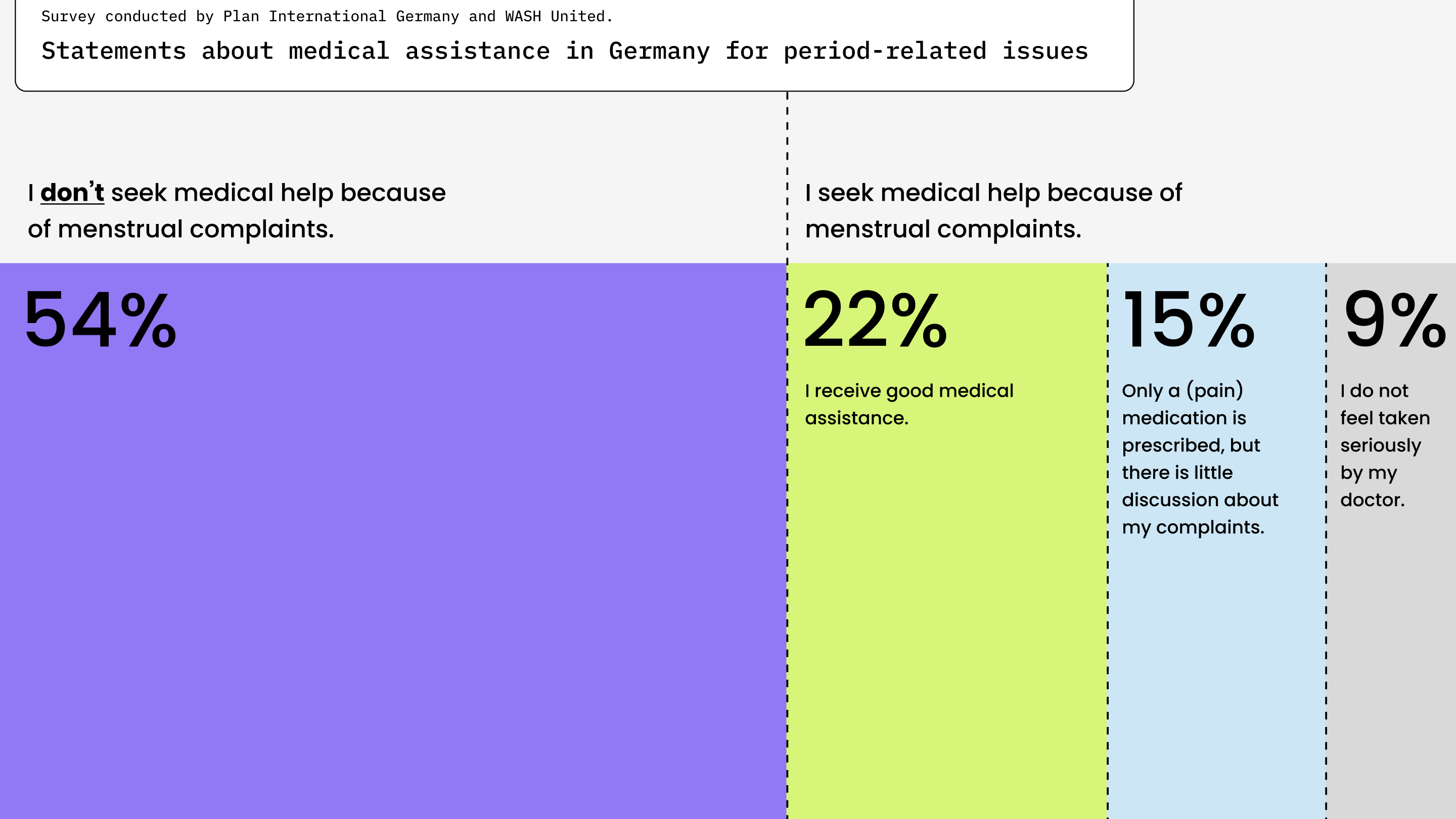 A study conducted by Plan International reveals that approximately 54% of menstruating individuals in Germany do not seek medical assistance for period-related issues. 15% report that doctors do not take sufficient time to address their complaints and only prescribe pain medication. The remaining 9% of women, dissatisfied with their medical visits, feel they are not taken seriously by medical personnel.1