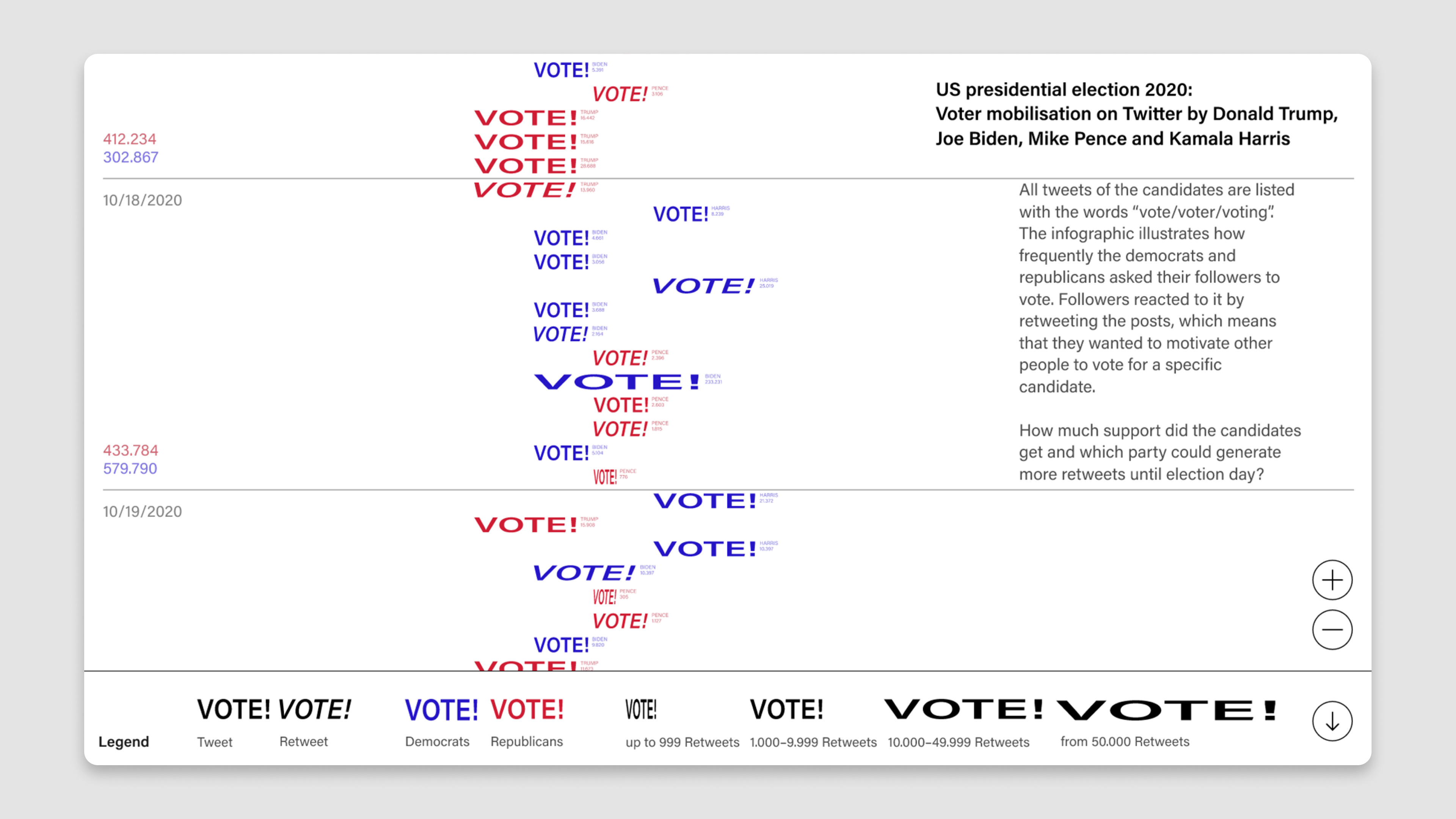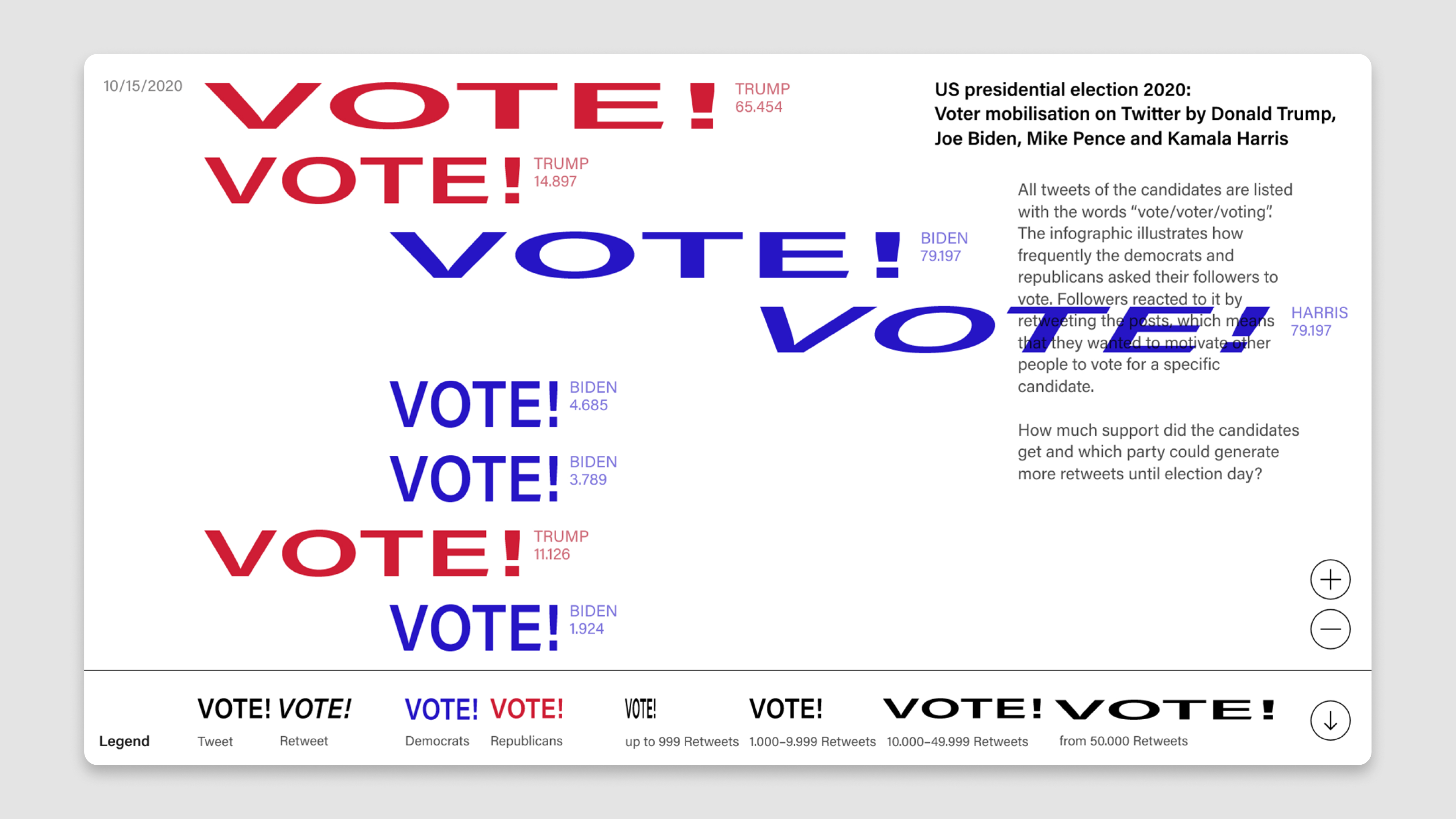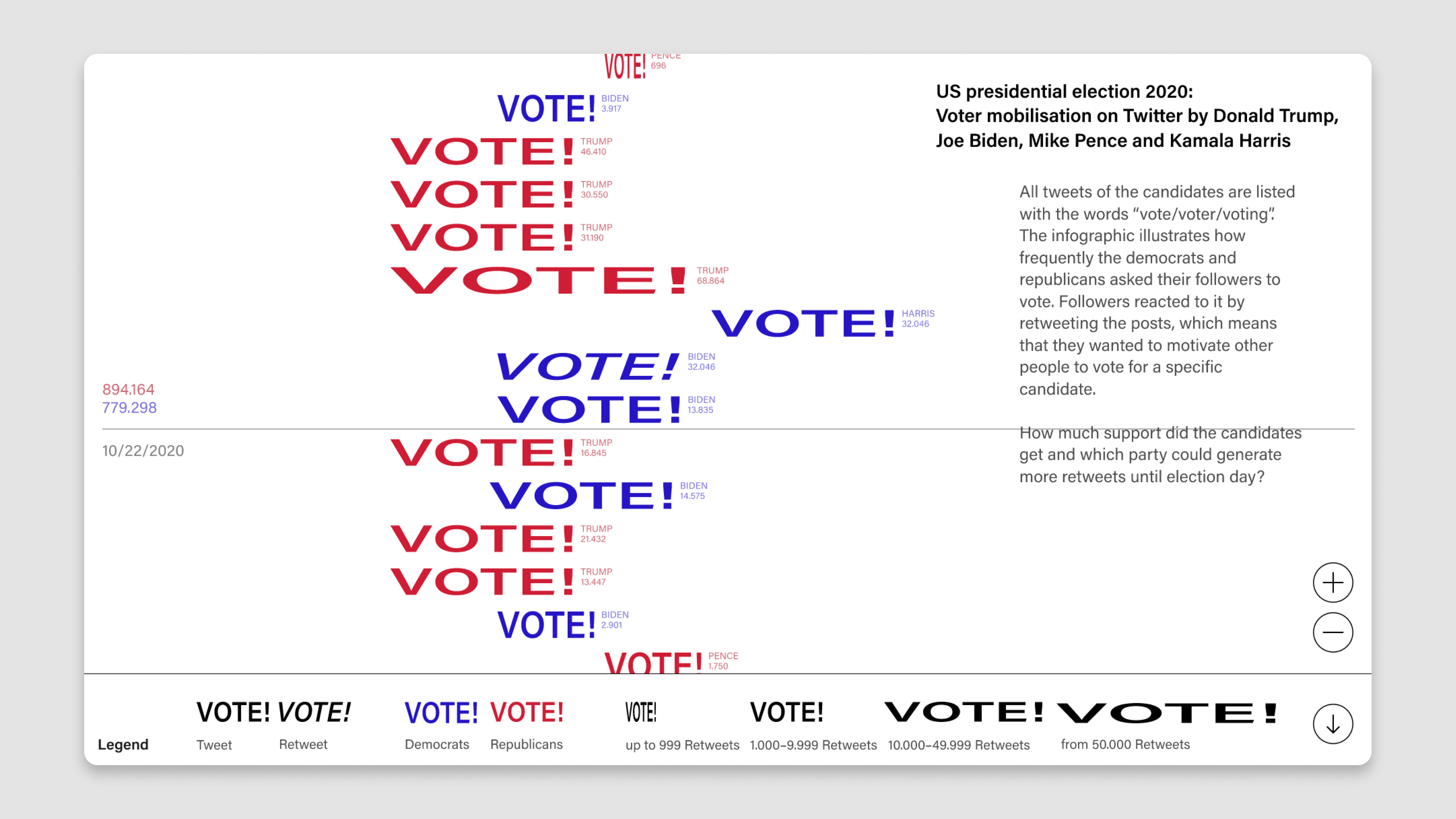 The data visualisation maps all tweets and retweets from Donald Trump, Joe Biden, and their respective vice-presidential candidates with the words vote/voter/voting. The popularity of a post is evaluated through retweets, which is depicted visually through typography. The higher the number of retweets, the broader the typography.
